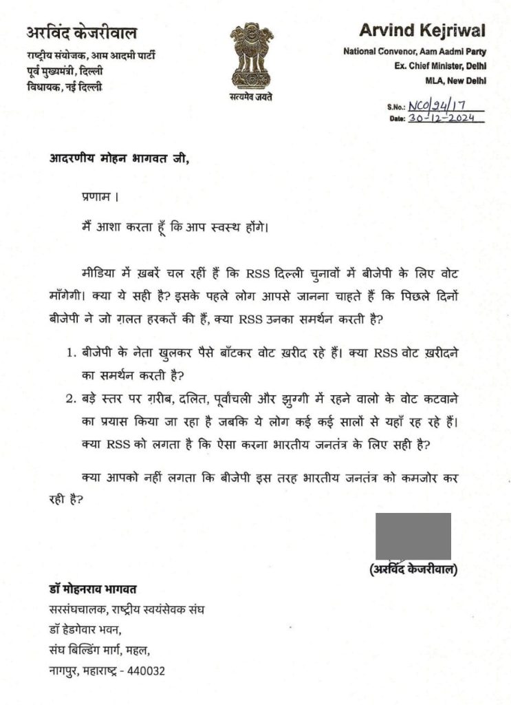 आरएसएस प्रमुख मोहन भागवत को लिखे गए पत्र में अरविंद केजरीवाल ने उनसे कई सवाल किए हैं