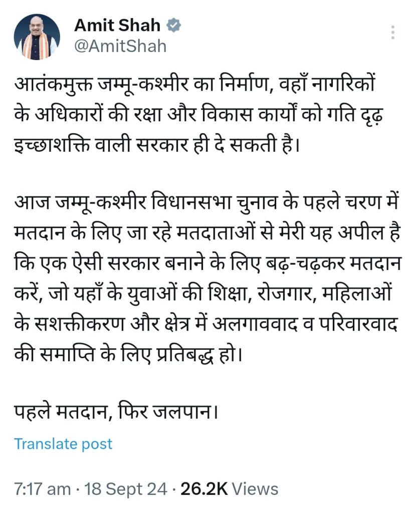 केंद्रीय गृहमंत्री और बीजेपी के वरिष्ठ नेता अमित शाह ने जम्मू कश्मीर वासियों से वोट करने की अपील करते हुए कहा कि “आतंकमुक्त जम्मू-कश्मीर का निर्माण, वहाँ नागरिकों के अधिकारों की रक्षा और विकास कार्यों को गति दृढ़ इच्छाशक्ति वाली सरकार ही दे सकती है। आज जम्मू-कश्मीर विधानसभा चुनाव के पहले चरण में मतदान के लिए जा रहे मतदाताओं से मेरी यह अपील है कि एक ऐसी सरकार बनाने के लिए बढ़-चढ़कर मतदान करें, जो यहाँ के युवाओं की शिक्षा, रोजगार, महिलाओं के सशक्तीकरण और क्षेत्र में अलगाववाद व परिवारवाद की समाप्ति के लिए प्रतिबद्ध हो। पहले मतदान, फिर जलपान।”