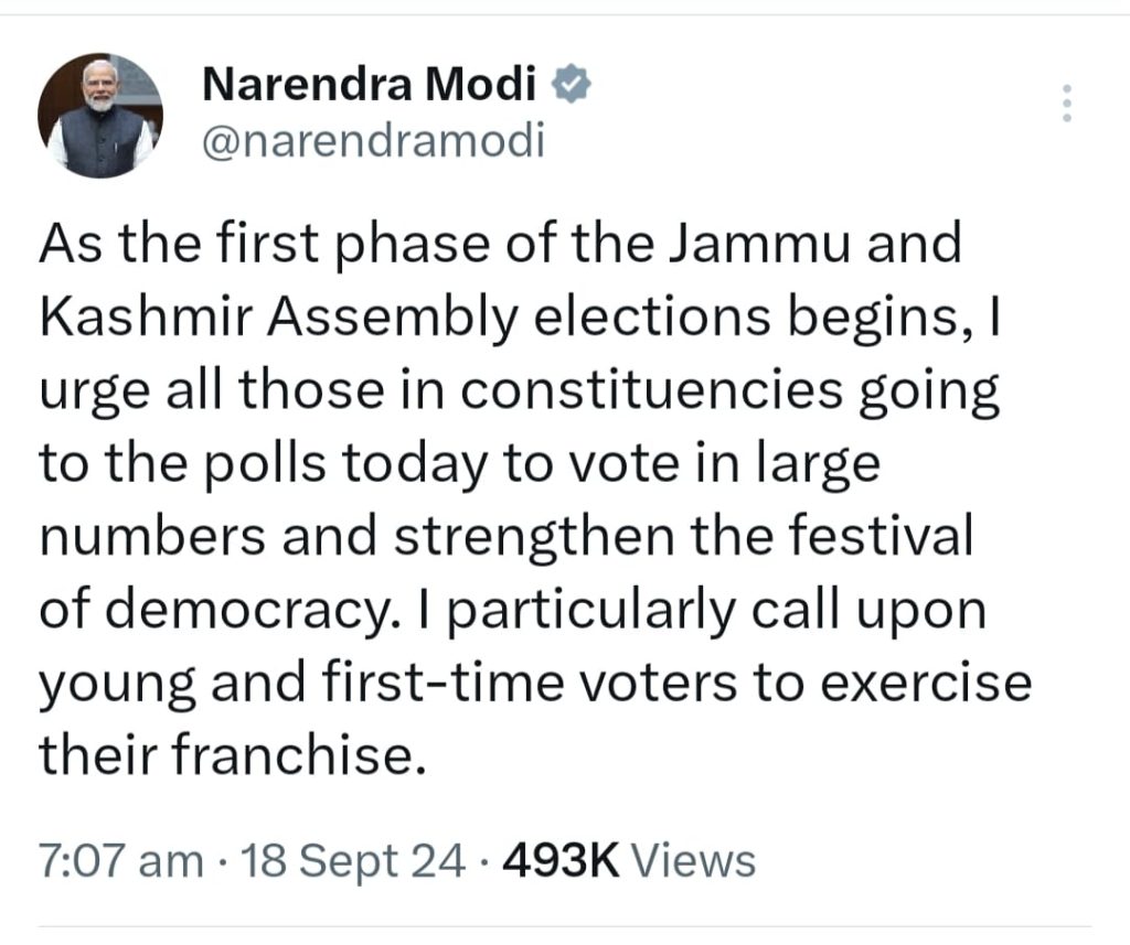 प्रधानमंत्री नरेन्द्र मोदी ने जम्मू कश्मीर के लोगों से वोट करने की अपील करते हुए कहा कि “जम्मू-कश्मीर विधानसभा चुनाव के पहले चरण की शुरुआत होने के साथ, आज मैं मतदान करने वाले सभी निर्वाचन क्षेत्रों के लोगों से बड़ी संख्या में मतदान करने और लोकतंत्र के उत्सव को मजबूत करने का आग्रह करता हूं। मैं, युवा और पहली बार मतदान करने वाले मतदाताओं से अपने मताधिकार का इस्तेमाल करने का भी आग्रह करता हूं।”