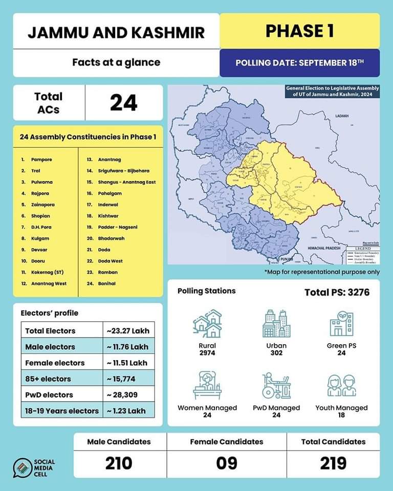 चुनाव आयोग सुरक्षा के मद्देनजर जम्मू-कश्मीर में 3 चरणों में मतदान करा रहा है। दूसरे चरण के लिए 25 सितंबर और तीसरे तथा अंतिम चरण के लिए 1 अक्टूबर को मतदान होगा