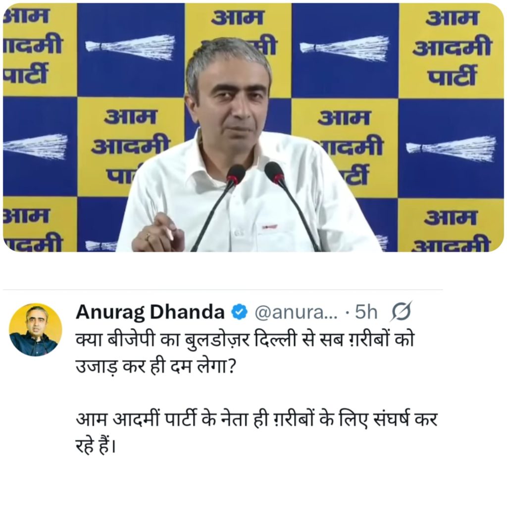 आम आदी पार्टी के नेता और प्रमुख प्रवक्ता अनुराग ढांडा ने कहा कि “क्या बीजेपी का बुलडोज़र दिल्ली से सब ग़रीबों को उजाड़ कर ही दम लेगा? आम आदमीं पार्टी के नेता ही गरीबों के लिए संघर्ष कर रहे हैं।”