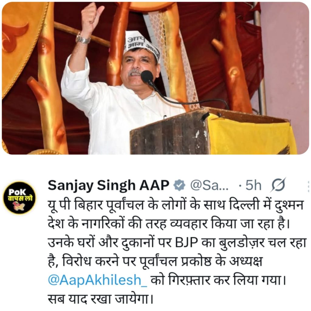 आम आदमी पार्टी के वरिष्ठ नेता और राज्यसभा सांसद संजय सिंह ने कहा कि “यूपी बिहार पूर्वांचल के लोगों के साथ दिल्ली में दुश्मन देश के नागरिकों की तरह व्यवहार किया जा रहा है। उनके घरों और दुकानों पर बीजेपी (BJP) का बुलडोज़र चल रहा है। विरोध करने पर पूर्वांचल प्रकोष्ठ के अध्यक्ष अखिलेश पति त्रिपाठी को गिरफ़्तार कर लिया गया। सब याद रखा जायेगा।”