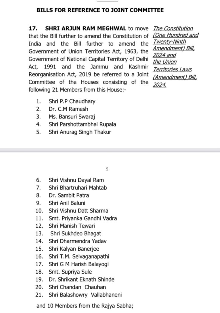 जेपीसी कमेटी में लोकसभा से 21 सांसदों और राज्यसभा से 10 सांसदों को ज्वॉइंट पार्लियामेंट कमेटी में शामिल किया गया है। इस कमेटी में कांग्रेस की तरफ से वायनाड लोकसभा सीट सांसद प्रियंका गांधी वाड्रा, सांसद मनीष तिवारी और सांसद सुखदेव भगत सिंह को शामिल किया गया है।