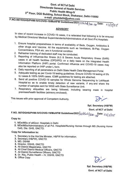 दिल्ली सरकार के स्वास्थ्य विभाग द्वारा जारी इस एडवाइजरी में सभी अस्पतालों को सतर्क रहने और कोविड से निपटने की पूरी तैयारी रखने के निर्देश दिए गए हैं। एडवाइजरी में स्पष्ट किया गया है कि अस्पतालों को यह सुनिश्चित करना होगा कि उनके पास पर्याप्त बेड, ऑक्सीजन सिलेंडर, एंटीबायोटिक दवाएं, अन्य आवश्यक दवाइयां और कोविड-19 वैक्सीन उपलब्ध हों। इसके साथ ही वेंटिलेटर, बाय-पैप, ऑक्सीजन कंसंट्रेटर और PSA प्लांट(प्रेशर स्विंग ऐड्सॉर्प्शन) जैसे उपकरण भी पूरी तरह कार्यशील स्थिति में हों।