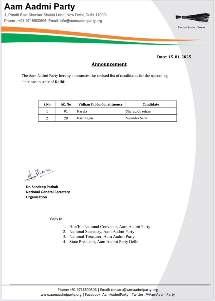 दिल्ली विधानसभा चुनाव 2025: AAP ने नरेला और हरि नगर सीट पर प्रत्याशी बदले