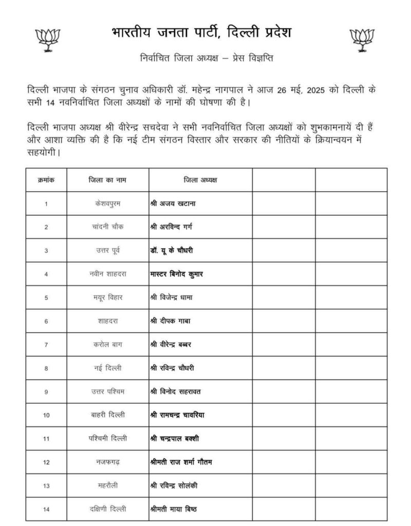 BJP ने अजय खटाना को केशवपुरम जिले, अरविंद गर्ग को चांदनी चौक जिले, यूके चौधरी को उत्तर-पूर्व जिले, वीरेंद्र बब्बर को करोलबाग जिले, विनोद सहरावत को उत्तर-पश्चिम जिले, रामचंद्र बावरिया को बाहरी दिल्ली जिले, चंद्रपाल बक्शी को पश्चिमी जिले और रविंद्र सोलंकी को महरौली जिले के अध्यक्ष पद की जिम्मेदारी सौंपी गई है।