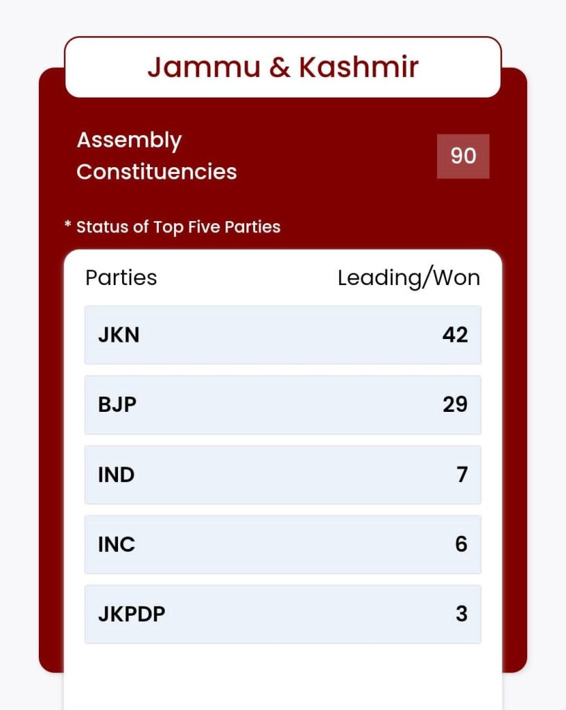 जम्मू कश्मीर विधानसभा चुनाव में 90 विधानसभा सीटों पर चुनाव हुए जिसमें जम्मू कश्मीर नेशनल कांफ्रेंस पार्टी को 42 सीटों जीत मिली, कांग्रेस पार्टी को 6 सीटों पर जीत प्राप्त हुई। वंही भारतीय जनता पार्टी को 29 सीटों पर और जम्मू कश्मीर पीपुल्स डेमोक्रेटिक पार्टी को 3 सीटों पर और पीपुल्स कांफ्रेंस पार्टी ने 1 सीट, सीपीआई (एम) ने 1, आम आदमी पार्टी ने 1 सीट और 7 सीटों पर निर्दलीय उम्मीदवारों ने जीत दर्ज की।