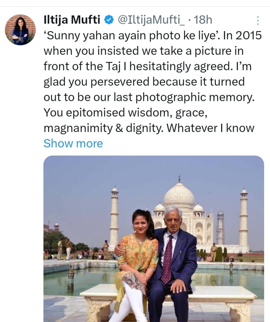 जम्मू कश्मीर विधानसभा चुनाव के परिणामों का इंतजार करते हुए मंगलवार, 8 अक्टूबर को इल्तिजा मुफ्ती ने अपने दादा मुफ्ती मुहम्मद सईद को याद करते हुए एक भावनात्मक पोस्ट सोशल मीडिया पर लिखा। उन्होंने एक पुरानी तस्वीर शेयर करते हुए लिखा “सन्नी यहां आइएं फोटो के लिए। 2015 में जब आप ने ताज के सामने तस्वीर लेने के लिए जोर दिया तो मैं झिझकते हुए मान गई थी। मुझे खुशी है कि आप ने हार नहीं मानी क्योंकि यही हमारी आखिरी तस्वीर बनकर रह गई। आप ज्ञान, गरिमा और उदारता की मिसाल थे। मैं जो कुछ भी जानती हूं, जो कुछ भी हूं, आपकी वजह से हूं। काश आज आप यहां होते। दुनिया के सबसे अच्छे दादा। हम आपको याद करते हैं।”