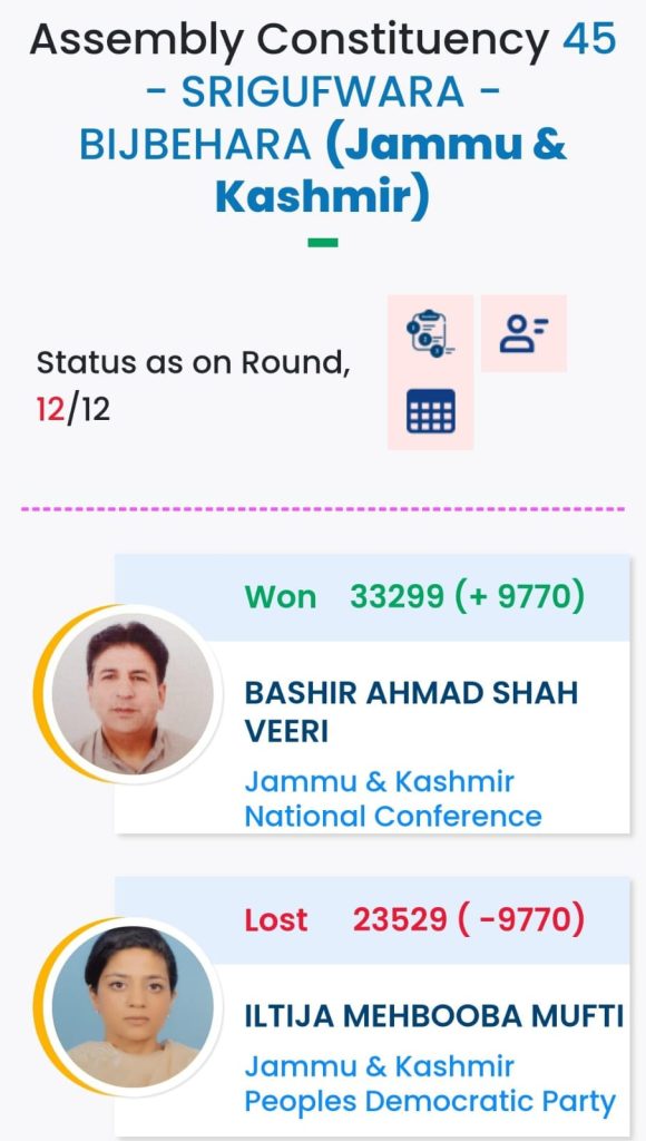 नेशनल कांफ्रेंस के उम्मीदवार बशीरअहमद शाह वीरी ने जीत दर्ज करते हुए इल्तिजा मुफ्ती 9770 वोटों से हराया। विधानसभा चुनाव में हार के बाद पीडीपी नेता इल्तिजा मुफ्ती ने सोशल मीडिया पर एक पोस्ट लिखते हुए कहा कि “मैं जनादेश को स्वीकार करती हूं। बिजबेहरा में सभी से मुझे जो प्रेम और स्नेह मिला। वह हमेशा मेरे साथ रहेगा। इस अभियान के दौरान कड़ी मेहनत करने वाले पीडीपी कार्यकर्ताओं का आभार।”