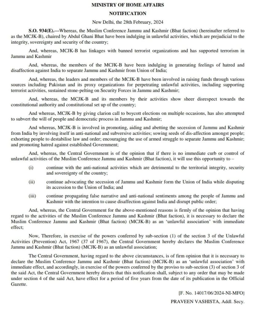 अब्दुल गनी भट की अध्यक्षता वाला जेके मुस्लिम कॉन्फ्रेंस जम्मू और कश्मीर (भट गुट) गैरकानूनी गतिविधियों में शामिल रहा है, जो देश की अखंडता, संप्रभुता और सुरक्षा को नुकसान पहुंचाने वाला रहा है। एमसीजेके-बी के प्रतिबंधित आतंकवादी संगठनों के साथ संबंध रहे हैं और उसने जम्मू-कश्मीर में आतंकवाद का समर्थन किया है। इतना ही नहीं एमसीजेके-बी के सदस्यों ने जम्मू-कश्मीर को भारत से अलग करने के लिए देश के खिलाफ नफरत और असंतोष की भावना पैदा करने की गतिविधियों को अंजाम दिया था।