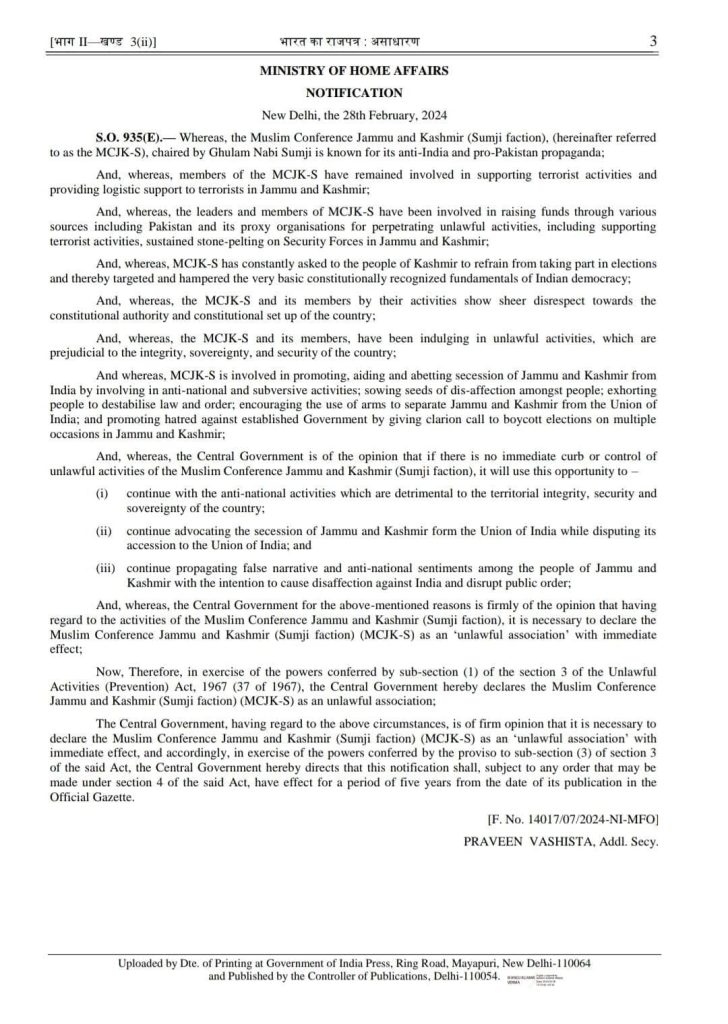 वहीं, नरेन्द्र मोदी सरकार ने जिस दूसरे संगठन पर प्रतिबंध लगाया है वो गुलाम नबी सुमजी की अध्यक्षता वाला मुस्लिम कॉन्फ्रेंस जम्मू और कश्मीर (सुमजी गुट) है। गृह मंत्रालय ने इसकी गतिविधियों को भी भारत विरोधी और पाकिस्तान समर्थक प्रचार वाला पाया है। इसके चलते ही इस पर प्रतिबंध लगाया गया है। एमसीजेके-एस के सदस्यों के खिलाफ सरकार ने पाया है कि जम्मू और कश्मीर में यह संगठन आतंकवादी गतिविधियों का समर्थक रहा है और आतंकवादियों को कई तरह की सहायता मुहैया कराने में उनकी भूमिका पायी गई है।