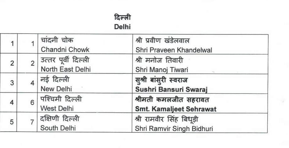 भारतीय जनता पार्टी ने दिल्ली की नई दिल्ली लोकसभा सीट से बांसुरी स्वराज को केंद्रीय मंत्री और वर्तमान सांसद मीनाक्षी लेखी का टिकट कटा कर इन्हें टिकट दिया गया है। वंही चांदनी चौक लोकसभा सीट से प्रवीन खंडेलवाल को वर्तमान सांसद डॉ हर्षवर्धन की टिकट को काट कर इन्हें टिकट दिया गया है। उत्तर पूर्वी दिल्ली लोकसभा सीट से एक बार फिर से मनोज तिवारी को उम्मीदवार बनाया गया है। दक्षिणी दिल्ली लोकसभा सीट से रामवीर सिंह बिधूड़ी को वर्तमान सांसद रमेश बिधूड़ी का टिकट काट कर इन्हें उम्मीदवार बनाया गया है। इसके साथ ही पश्चिमी दिल्ली से वर्तमान सांसद प्रवेश वर्मा की टिकट काट कर कमलजीत शेहरावत को उम्मीदवार बनाया गया है।