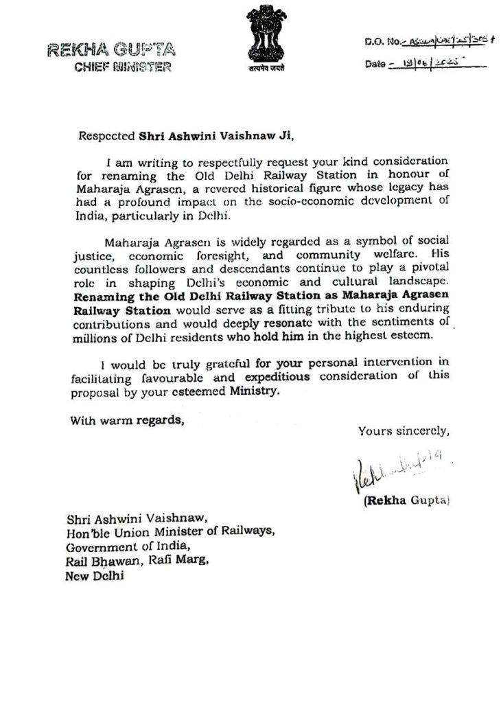 दिल्ली की मुख्यमंत्री रेखा गुप्ता ने केंद्रीय रेल मंत्री अश्विनी वैष्णव को लिखे गए पत्र में कहा कि “मैं आपसे पुरानी दिल्ली रेलवे स्टेशन का नाम बदलकर महाराजा अग्रसेन के सम्मान में रखने पर विचार करने का आदरपूर्वक अनुरोध करती हूं। महाराजा अग्रसेन एक सम्मानित ऐतिहासिक व्यक्तित्व थे। जिनकी विरासत का भारत के सामाजिक-आर्थिक विकास पर विशेष रूप से दिल्ली में गहरा प्रभाव पड़ा है। स्टेशन का नाम बदलकर महाराजा अग्रसेन रेलवे स्टेशन रखना उनके स्थायी योगदान के प्रति सच्ची श्रद्धांजलि होगी और यह उन लाखों दिल्लीवासियों की भावनाओं से गहराई से जुड़ेगा। जो उनका बहुत सम्मान करते हैं।”