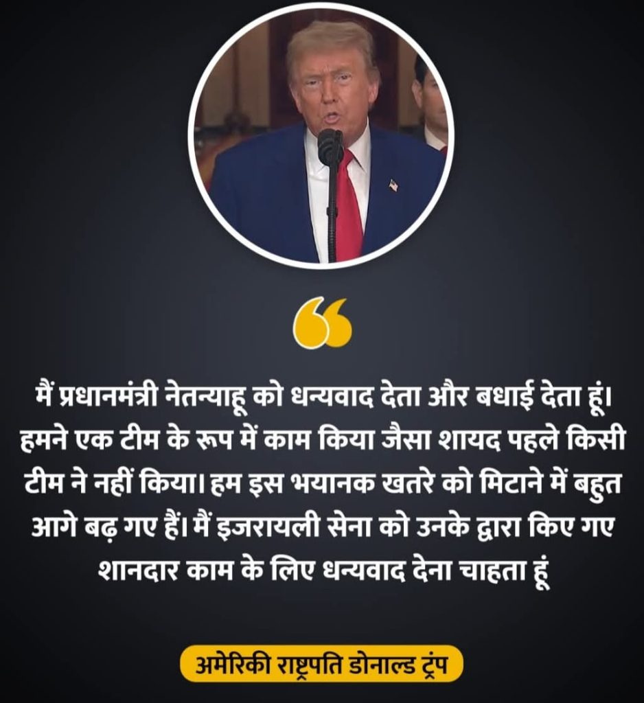 अमेरिकी राष्ट्रपति डोनाल्ड ट्रंप ने आगे कहा कि “आज रात, मैं दुनिया को बता सकता हूं कि हमला एक शानदार सैन्य सफलता थी। मैं प्रधानमंत्री बेंजामिन नेतन्याहू को धन्यवाद देना चाहता हूं और बधाई देना चाहता हूं। हमने एक टीम के रूप में काम किया, जैसा कि शायद पहले कभी किसी टीम ने काम नहीं किया और हम इजरायल के लिए इस भयानक खतरे को मिटाने में काफी आगे बढ़ गए हैं।”