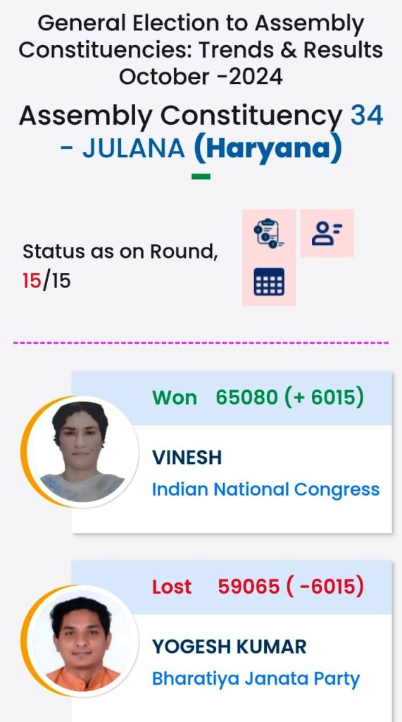 विनेश फोगाट ने जुलाना से 6015 वोटों से जीत दर्ज कर बनाई नई पहचान